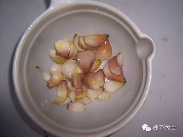 1、选取健康的百合种球,清理掉泥土和破损、干瘪的鳞片。2、把边缘的鳞片一层层剥下来,鳞片上要带一些茎盘,这样比较容易生根。把鳞片放在多菌灵溶液中浸泡半个小时,放在通风处晾干。3、可以用消过毒的蛭石作为扦插介质,浇水浇透。4、把鳞片插入蛭石中,保持蛭石微微湿润,放在阴凉通风的地方。5、大约半个月左右,鳞片就会生根,一个月左右就会长出小的子球。