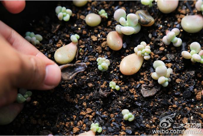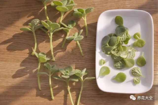2、把粗砂和泥炭土等量混合,铺在花盆中,土壤中也可以掺入珍珠岩、绿沸石、麦饭石、蛭石等颗粒土。(作者:二木花花男 来源:新浪博客)3、把多肉叶片平铺在土壤上,放在阴凉通风的地方。因为母叶中含有丰富的水分,此时不需要浇水。(作者:二木花花男 来源:新浪博客)4、大约两周后,叶片就会长根发芽,此时如果遇到母叶黑腐化水,就直接把母叶摘掉。(作者:二木花花男 来源:新浪博客)5、如果叶插的过程中,出现只长根、不长芽的情况,要尽快把根系埋入土中,少量浇水,不能让根系干枯,否则就很难长芽了。(作者:二木花花男 来源:新浪博客)6、如果叶插只长芽不长根,可以涂抹一些生根粉。(作者:柠檬橙518 来源:花吧)7、既不长芽也不长根的叶片,只要母叶没有损伤,花友们也不要着急扔掉,有些肉肉要等1个多月才会长芽长根呢。小芽成长一段时间后,会自己把母叶“吃掉”,母叶会干枯,此时小肉肉已经“断奶”,摘掉母叶就好。(作者:二木花花男 来源:新浪博客)