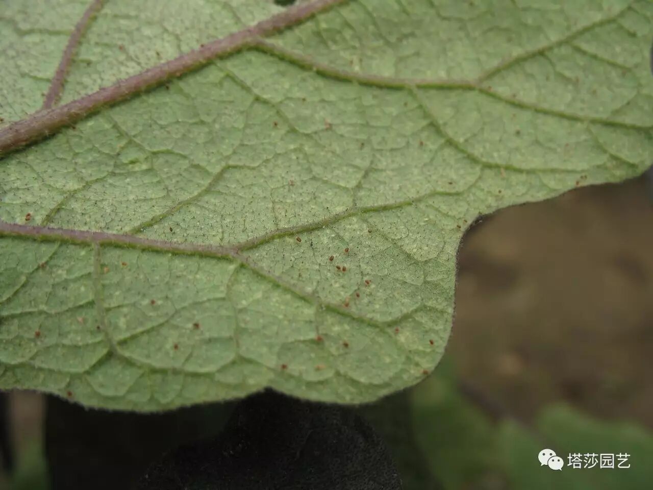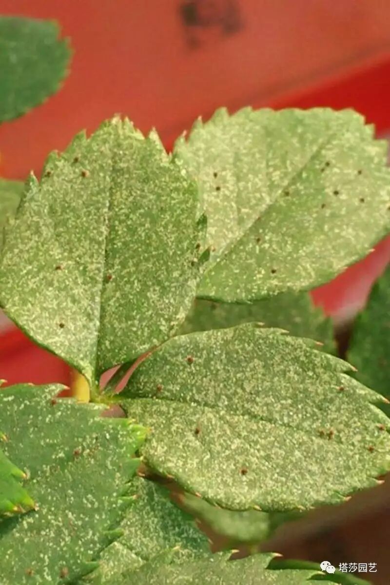 当你发现你的月季出现这样的小黄点,可以翻开叶子的背面,寻找元凶。红蜘蛛的个头非常小,通常只有1毫米不到,肉眼勉强能看到,红红的小点在叶子背面移动。