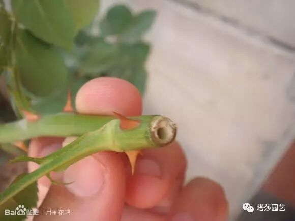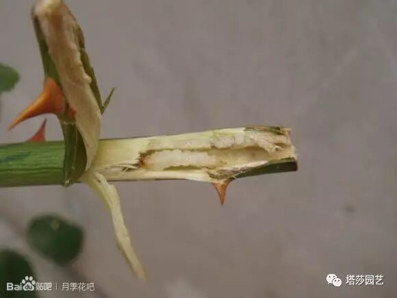 上图中的就是茎蜂,它们会蜇枝条根部,把卵产进枝条里。幼虫在茎秆中成长,蛀空月季茎心,导致枝条萎蔫,垂头,所以直接为害植物的并不是成虫,而是茎蜂的幼虫。当你发现月季的枝干萎蔫耷拉,则有可能是杆子中藏有茎蜂幼虫。