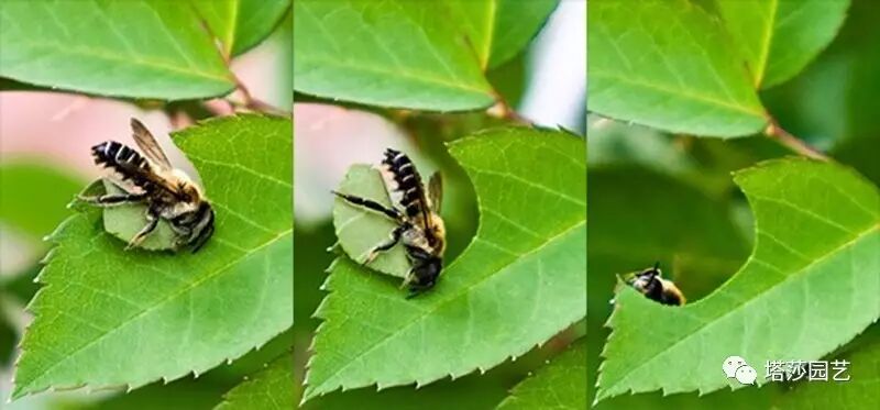 喏,就是它,为害的是成虫,它们会从植物的叶子上切取半圆形的小碎片带回家里筑巢,通常会选取嫩叶入手,从早到晚作业,来无影去无踪很难逮到它,等你发现切叶蜂降临时,月季上已经出现一个个整整齐齐的半圆了。