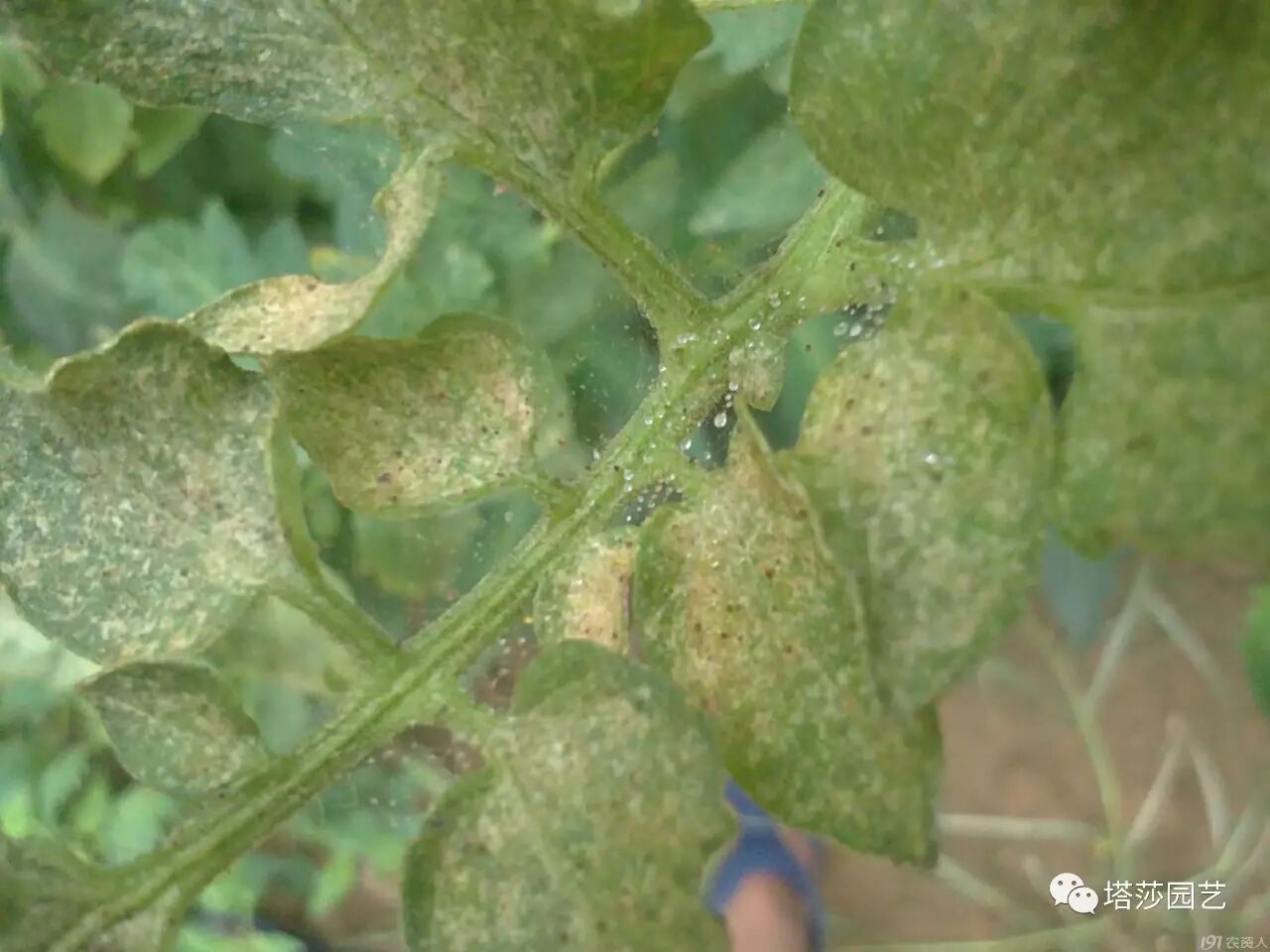 ▲后期严重受害的叶片,整株笼罩在蛛网中