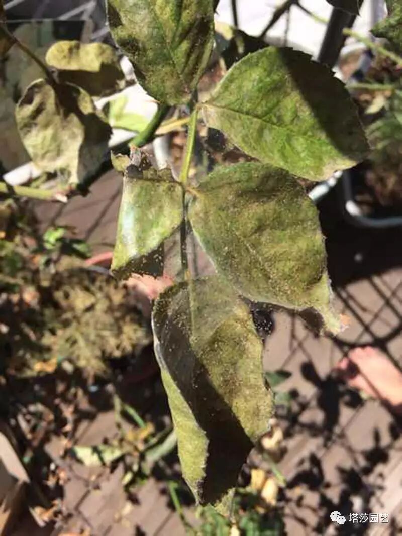 先说这个臭名昭著,也是问的最多的红蜘蛛。通常花友的描述是“我家的月季怎么叶子发黄了还有蜘蛛网啊?”一听到“蛛网”基本可以定为红蜘蛛,再一看图片,对了就是它了。